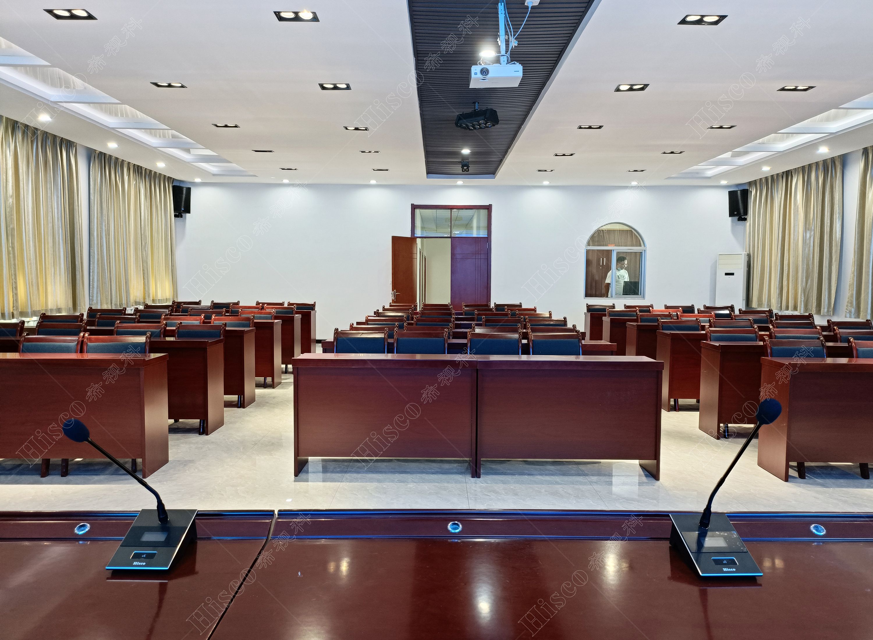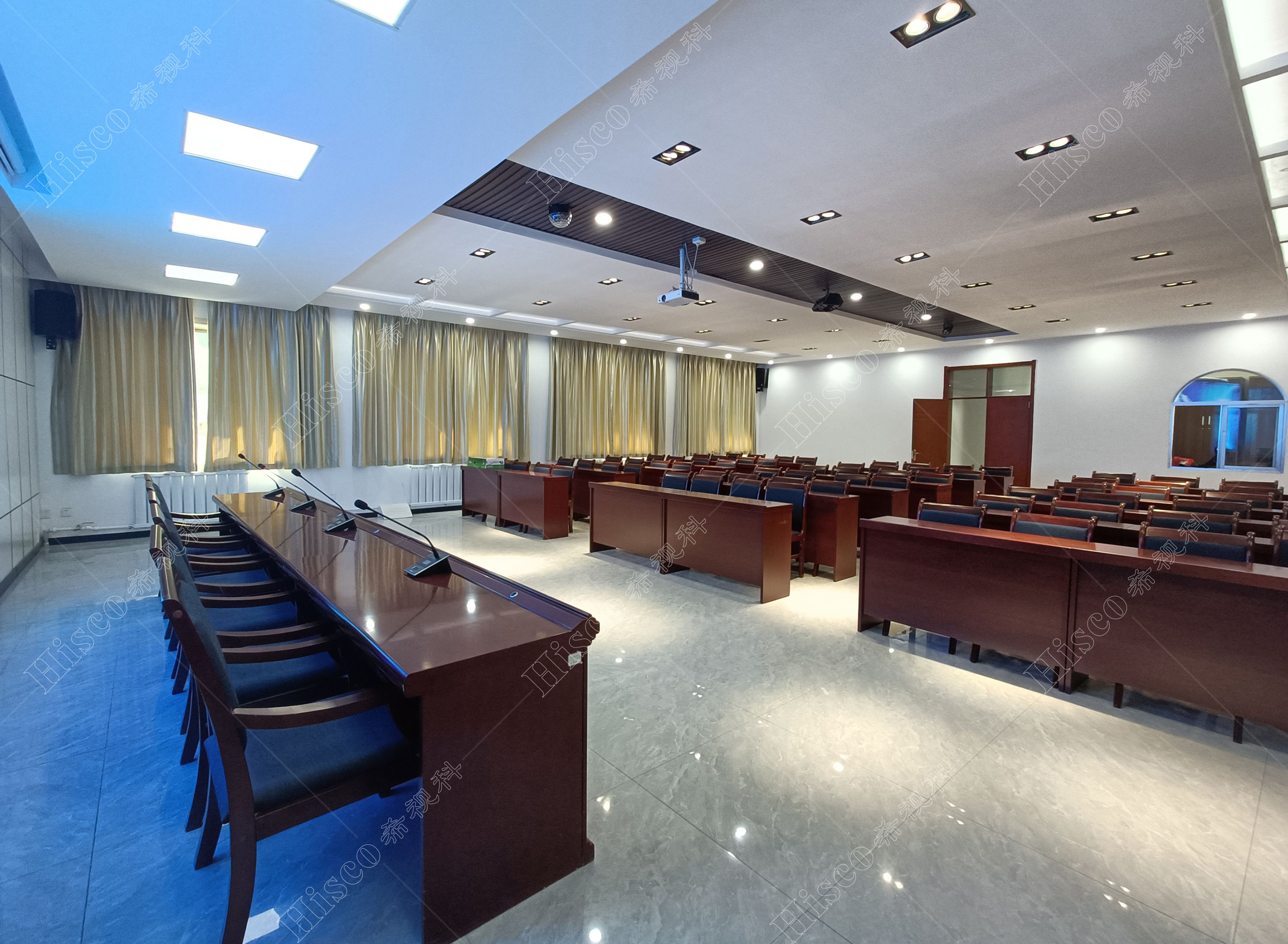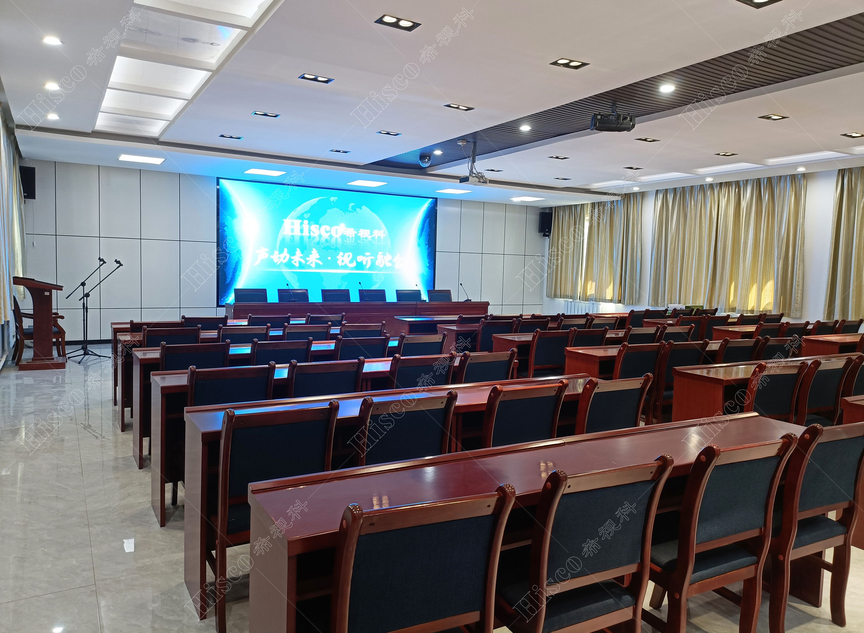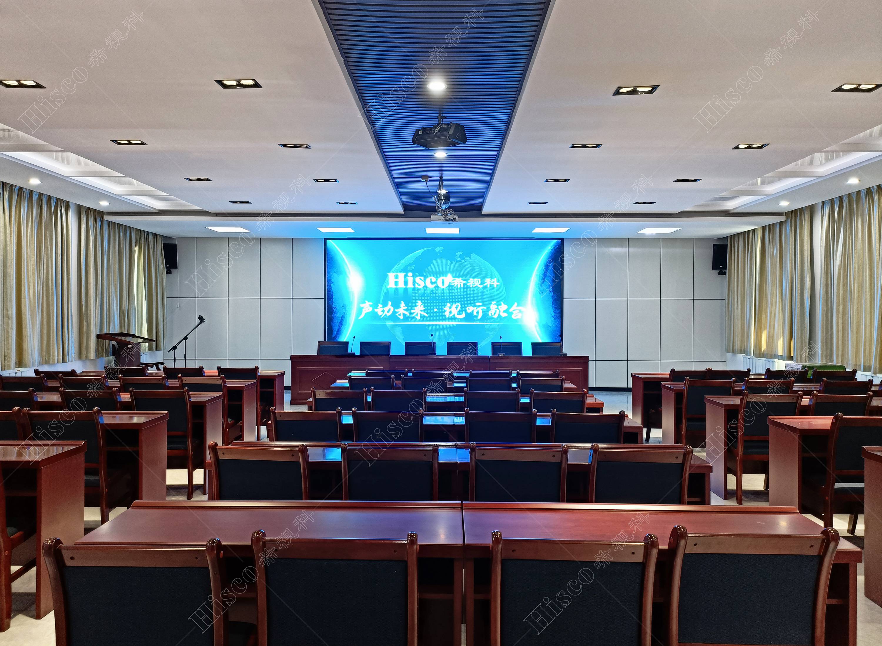 会议室内需要需要做扩声系统、会议系统、显示系统,智能化系统;满足日常开会的讨论、发言等等。综合礼堂的设计,追求语言的清晰图和饱和度,声压级级要求达到国家厅堂扩声系统一级标准。同时预留了丰富的接口,方便以后系统的扩展,实现整个系统的强大功能。同时有演出用的舞台,配置了专业的舞台灯光系统和演出扩声系统,加了超低音音箱和效果器,追求声音的饱满度和浑厚感,能够满足文艺演出,会议报告,庆典活动召开等功能。